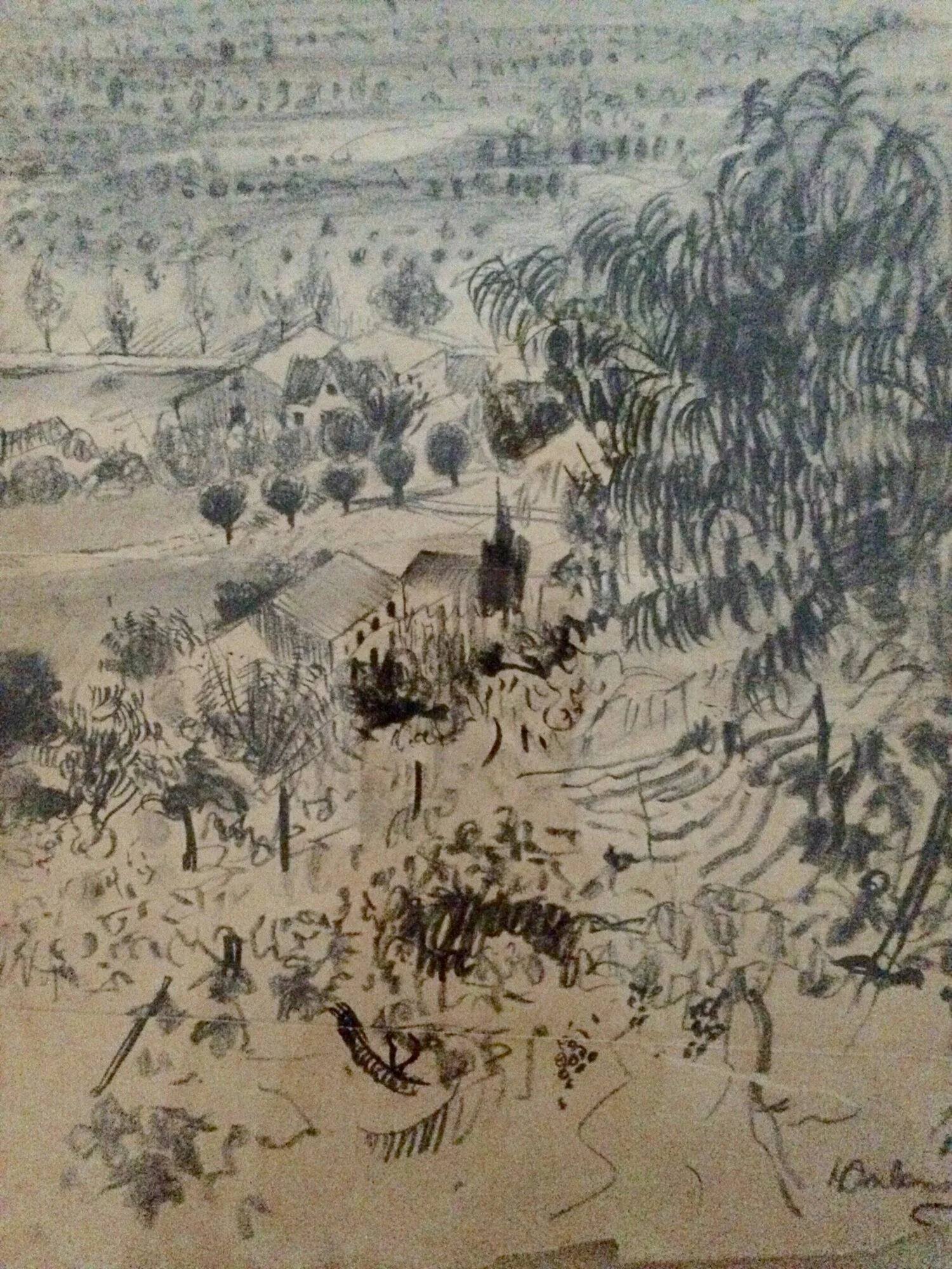 This painting is from the 1950's when Henry Inlander won the Prix de Rome, which is still considered one of the most prestigious prizes in the world of painting. The painting is a view of the valley that sits beneath the village of Anticoli Corrado. The style is a mixture of Asian and Eastern European art, bringing Chagall together with some of the scroll paintings that are such an important of art in China.