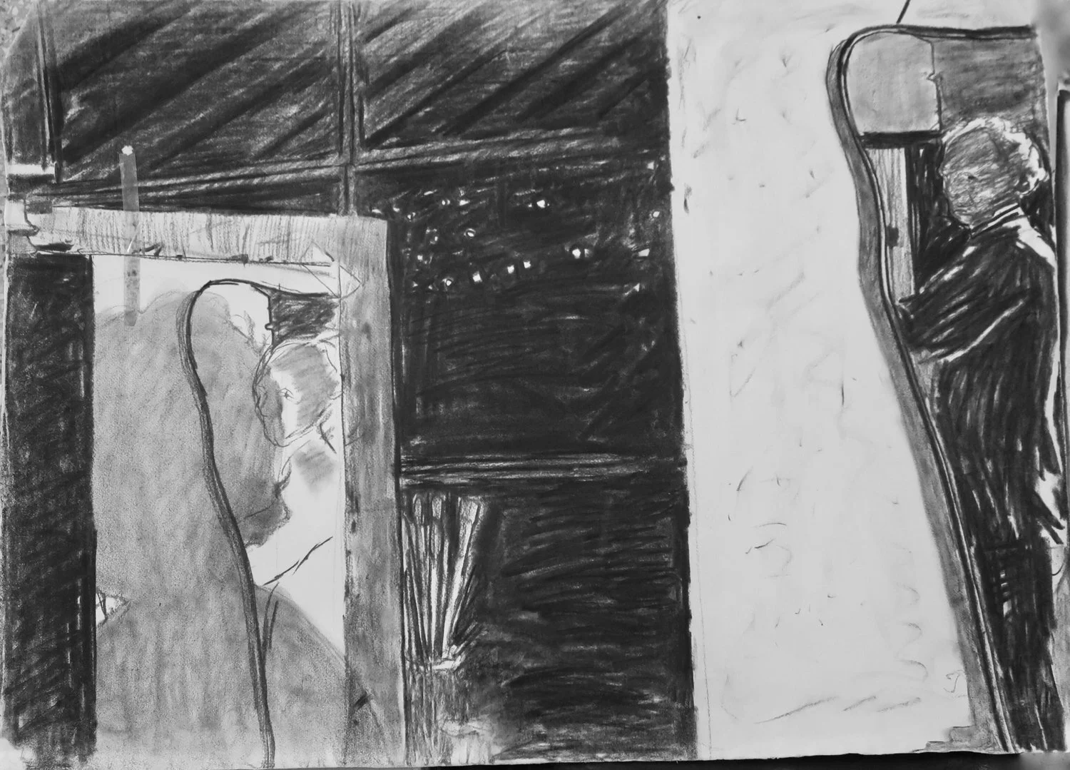 Inlander played with mirrors and reflections in many of his works. In this drawing, he explores the artist at work on his double. What does the double think about being drawn? Who is the author or creator of the image? Do mirrors tell the truth? What is an illusion?